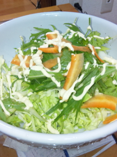 キャベツ千切り、セロリ適当切りw、パセリそのまんま、水菜引きちぎり、人参薄く切り(結局何切りか知らねww
