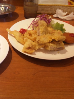 今日のメニューは、鳥の変わり天とクリームコロッケとロールキャベツでした。