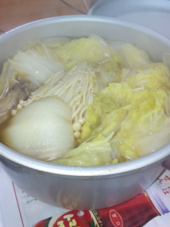 昆布で出汁をとって、豚肉、白菜、えのき、舞茸をぶち込んで酒と醤油で味を調えただけな適当鍋やけど、あったまったーーー!